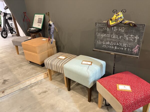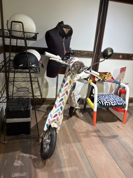 並んでいます。椅子や絵、EVレンタルバイク等々…