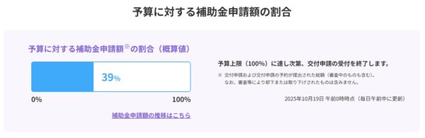 予算上限に対する2025年10月19日午前0時時点での消化率は39%ですが、受付期限は2025年12月31日となっております。