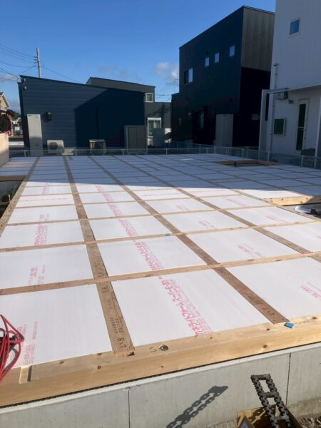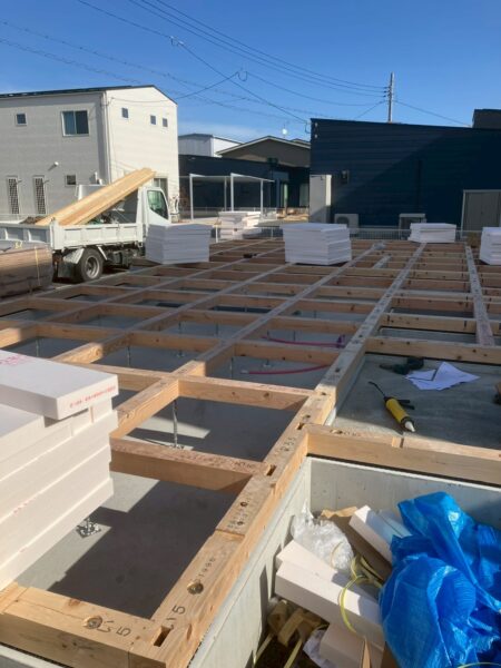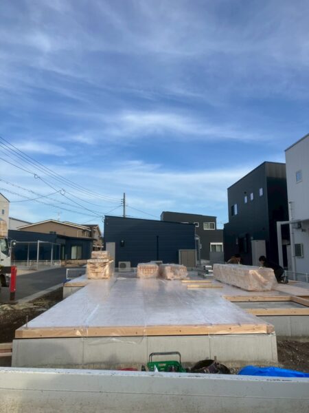 先日無事土台敷きが無事終わり仮設足場の設置も完了しました。